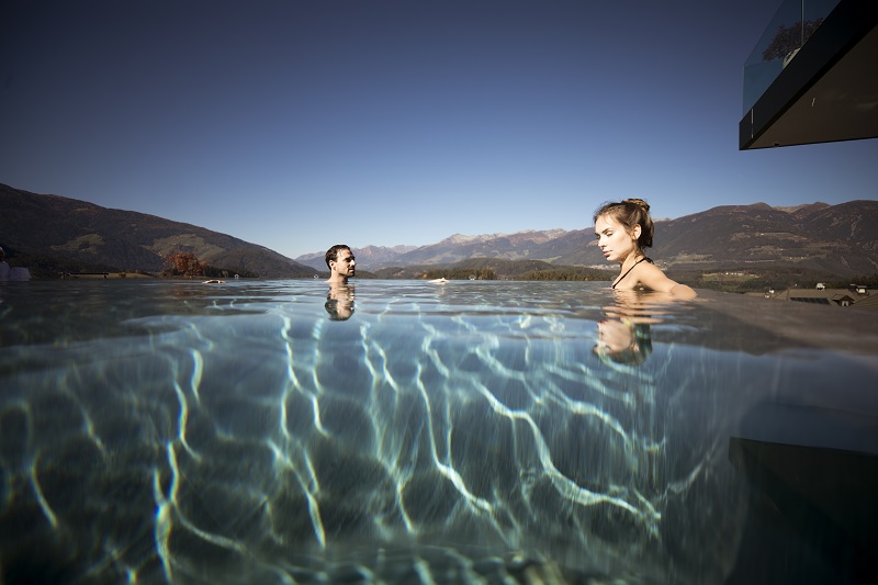 A pochi chilometri da Plan de Corones, a Pfalzes, il quarto hotel del gruppo Winkler ha il nome evocativo di “Sonnenhof”, l’hotel del sole. La location è sempre soleggiata, esposta a sud, con tanta luce e con tramonti che tingono il cielo di arancione e di giallo. Dall’alba al calar del sole, ci si riposa nel grandissimo giardino panoramico dell’hotel: nella piscina a sfioro il bordo non determina confini, lo specchio d’acqua dell’infinity pool sembra infinito, così come le montagne e la valle. Ci si perde letteralmente nel piacere di un lunghissimo bagno in questa grande vasca panoramica rivestita di pietra naturale, un piacere da vedere e da toccare. Per un idromassaggio caldo si può andare nella vasca circolare e lasciarsi massaggiare dall’acqua, mentre per rinfrescarsi ci si tuffa nel laghetto accanto alla piscina, che offre un bagno nell’acqua trasparente, con il fondale di pietre levigate. Il benessere è open air, in una scenografia idilliaca. Tra i massaggi rilassanti da provare c’è l’impacco Winkler ai fiori di fieno: il fieno di montagna dell’Alto Adige riduce lo stress e aumenta il benessere fisico, oltre a rinforzare il sistema immunitario.