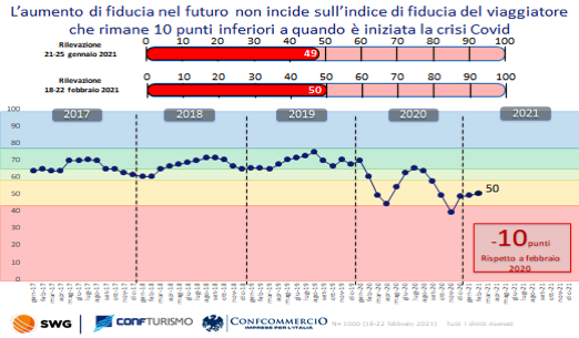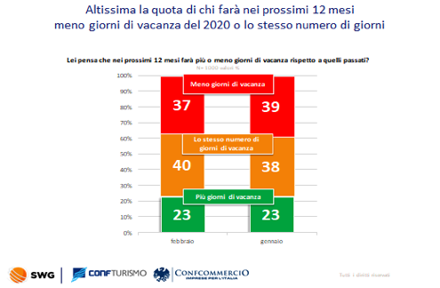 L’indice di fiducia si assesta ormai da 3 mesi su valori piuttosto deprimenti raggiungendo, a febbraio, quota 50 su 100, 10 punti sotto febbraio 2020. Il 37% degli intervistati dichiara che quest’anno farà meno vacanze dell’anno scorso, annus horribilis per il settore, e la data più probabile della prossima partenza viene identificata a giugno per un primo week end, a luglio per uno short break di 2-3 giorni e ad agosto per una vacanza di almeno 7 giorni.