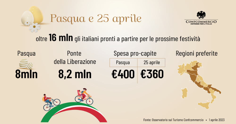 Oltre 16 milioni gli italiani pronti a partire per le vacanze nelle prossime festività: Pasqua e 25 aprile. Senza contare 2,5 milioni di indecisi, saranno almeno 8 milioni i vacanzieri pasquali, di cui il 60% farà 2 notti fuori casa, ma uno su dieci ‘si allungherà’ anche per tutta la settimana. Destinazioni all’interno della regione di appartenenza per uno su due mentre, della restante metà, 8 viaggeranno altrove ma sempre in Italia e 2 verso l’estero. Le località di mare sono le più ambite, nel 22% dei casi, seguite da città d’arte e borghi che, insieme, totalizzano un ulteriore 28%, per una spesa complessiva che dovrebbe attestarsi intorno ai 4 miliardi di euro.