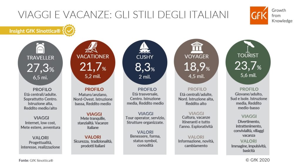 Un italiano su due ha intenzione di concedersi un viaggio, appena sarà possibile. Per immaginare come saranno le vacanze estive degli italiani nel dopo COVID-19 GfK Sinottica ha elaborato gli Stili Vacanza: cinque modalità differenti di approccio al mondo Travel&Holidays e cinque target da colpire con offerte e comunicazioni mirate.