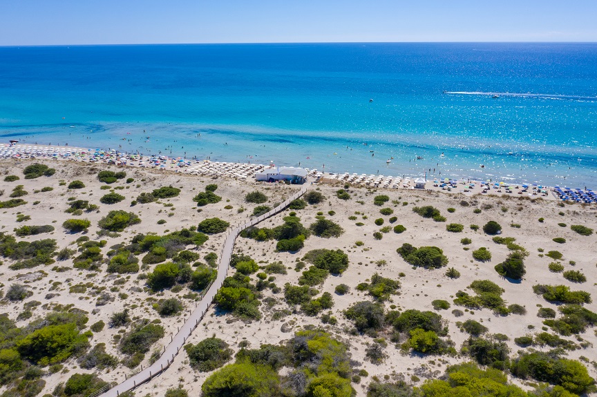 Le lunghe passeggiate a piedi nudi sulla sabbia finissima, la pineta avvolta nei profumi della macchia mediterranea, il bagno nell’acqua trasparente di questo tratto di mare, lo rendono un luogo vero e speciale. La spiaggia privata con lettini e ombrelloni è un highlight davvero unico in Salento e offre agli ospiti il privilegio di respirare l’aria della vacanza tra concerti delle cicale, sciabordio delle onde e vento tra gli alberi. Per raggiungere la splendida spiaggia, si cammina attraverso i giardini fioriti che circondano le scenografiche piscine disposte su diversi livelli, poi ci si immerge qualche minuto nella pineta per poi “sbucare” tra le dolci dune di sabbia e vedere davanti il mare. Il Parco Naturale Regionale Litorale di Ugento è un armonico contenitore di atmosfere mediterranee.