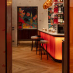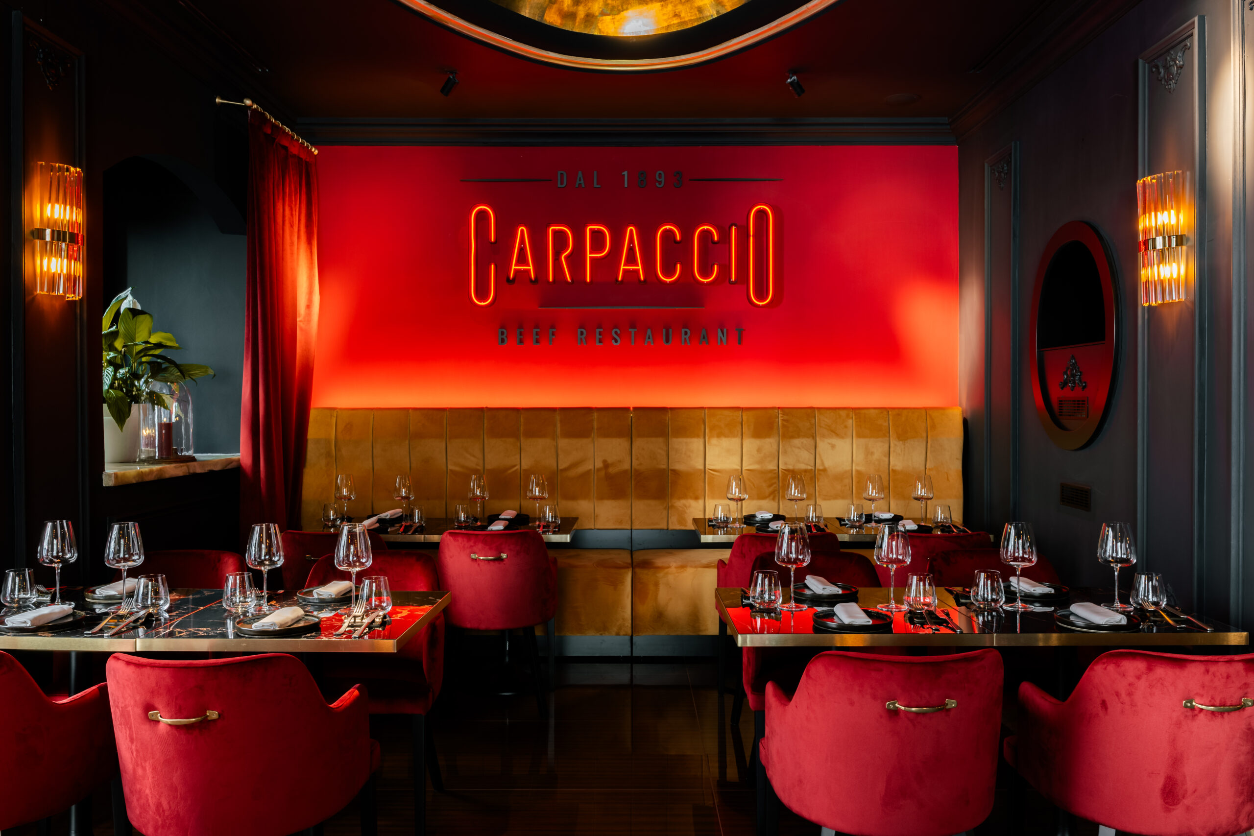Il locale, che prende il posto dello storico George è imponente, elegante e ricorda gli anni della dolce vita, dai materiali allo stile. Comode poltroncine in velluto bordeaux, tavolini neri in marmo portoro e pavimento in mogano – in tipico stile veneziano degli anni 70 per omaggiare la città di nascita del carpaccio – percorrono le diverse sale che si alternano tra la bottigliera esposta, la cucina a vista e la sala privata. Un ambiente unico in una zona di totale rilancio dopo la staticità vissuta nell’ultimo ventennio. Il progetto è firmato da Costa Group, società coinvolta nella cura e nel disegno della prima sfida di Carpaccio, quella di Beef Boys.