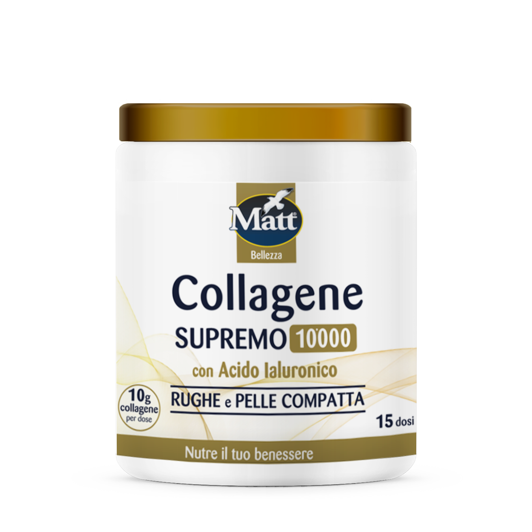 Il collagene è una proteina essenziale, naturalmente presente nel nostro corpo e principale responsabile del tono e della compattezza della pelle. Il passare degli anni e lo stress possono accelerarne il fisiologico calo: la formula di Collagene Supremo 10000 Matt contribuisce a contrastare questi effetti, grazie alla combinazione di ingredienti attivi.