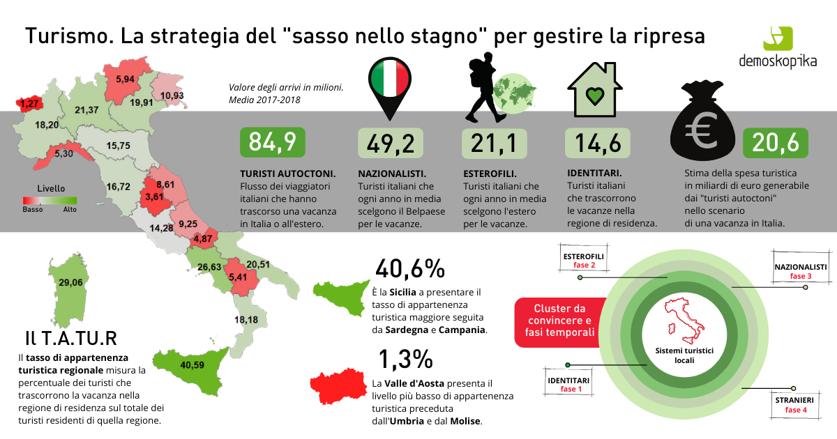 In questa direzione, Demoskopika ha ideato il T.a.tu.r, acronimo che sta per tasso di appartenenza turistica regionale quale rapporto dei turisti che trascorrono la vacanza nella regione di residenza sul totale dei vacanzieri residenti di quella regione. Tre i gruppi di turisti rilevati in coerenza con la strategia del “sasso nello stagno”: gli identitari, gli esterofili, e, infine, i nazionalisti.
