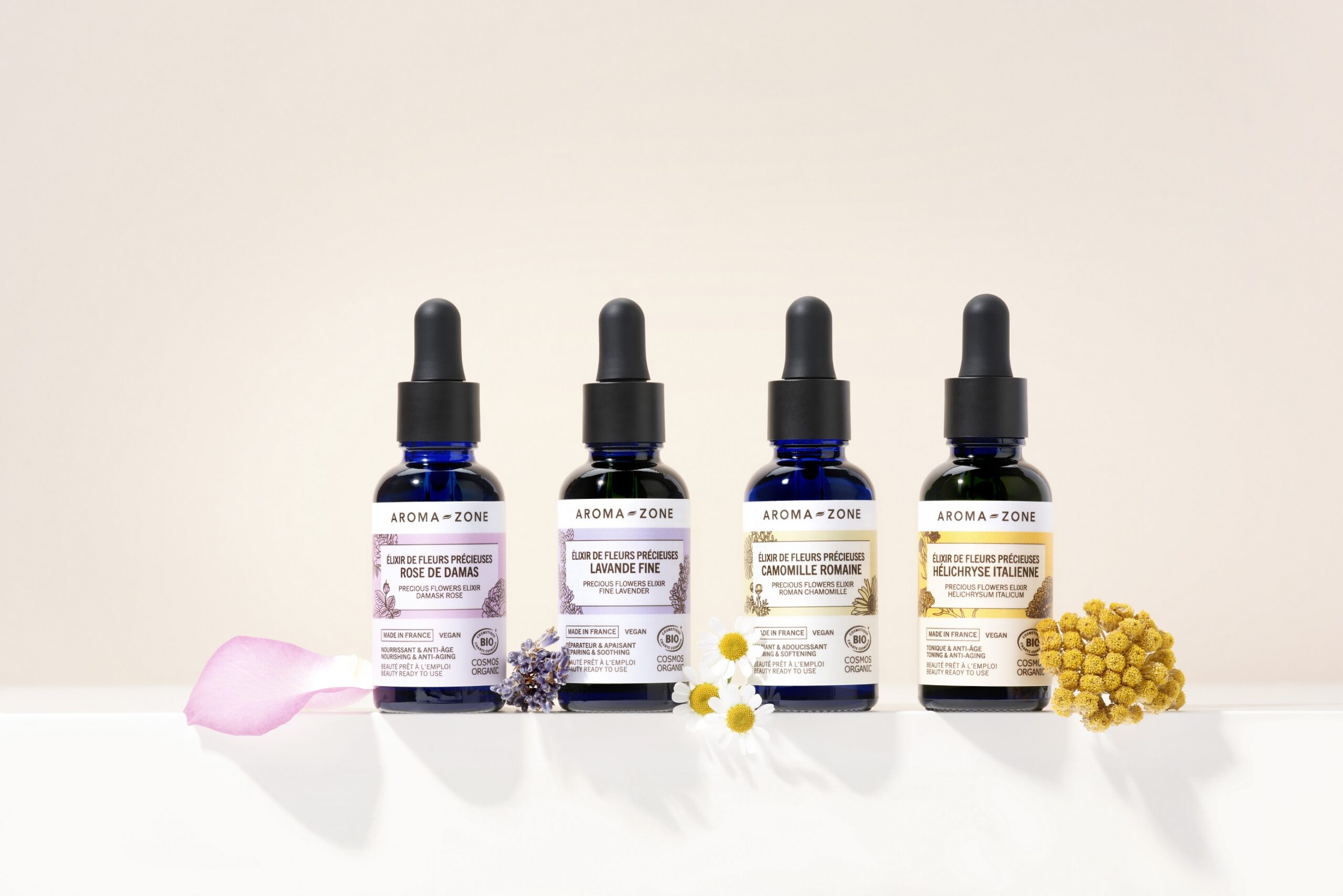 C’è l’elisir di rosa, che rivitalizza la cute secca e sensibile, quello di camomilla,che lenisce la pelle sensibile, quello di lavanda, ideale per riequilibrare il derma misto, e quello di elicriso che nutre e tonifica l’epidermide secco o maturo. Sono i 4 elisir floreali che Aroma-Zone propone per prendersi cura di ogni tipo di pelle. Si tratta di oli preziosi ottenuti dalla macerazione dei petali infusi inolio vegetale. Nella skincare quotidiana possono essere utilizzati come siero viso, come alternativa leggera alla crema giorno, o come trattamento intensivo notturno per le pelli secche e mature.