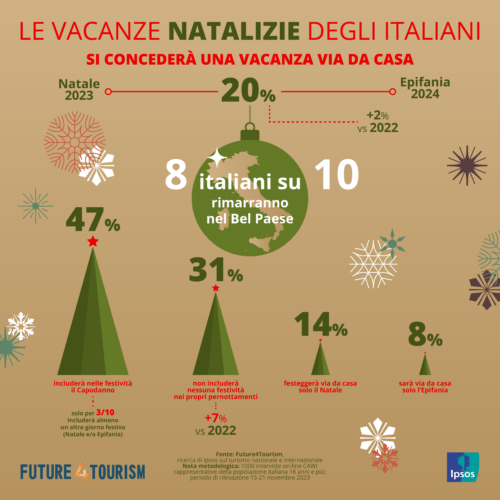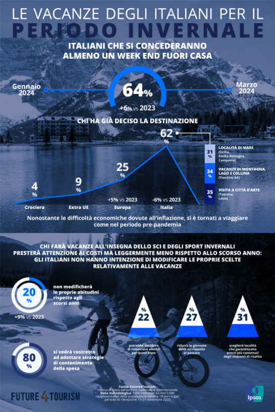 Il nuovo aggiornamento dell’indagine Ipsos, Future4Tourism, racconta che la voglia di vacanza degli italiani non si ferma nonostante le difficoltà economiche dovute all’inflazione. Il 64% dei connazionali prevede di fare almeno un periodo di vacanza tra gennaio e marzo 2024 riportando la percentuale dei vacanzieri ai livelli pre-pandemia.