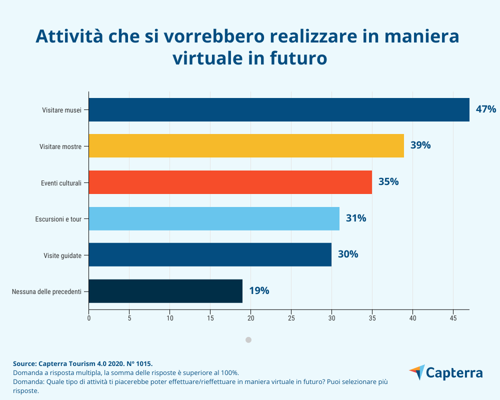 Il 77% dei turisti italiani ha provato o è stato incuriosito dalle esperienze di turismo virtuale. Il 58% degli intervistati ha dichiarato di aver optato per scegliere di fare attività turistiche in maniera virtuale nell’estate appena trascorsa, mentre il 19% non le ha scelte ma ne è rimasto estremamente incuriosito. Questi dati dimostrano come vi sia un interesse crescente verso le attività virtuali legate al turismo.