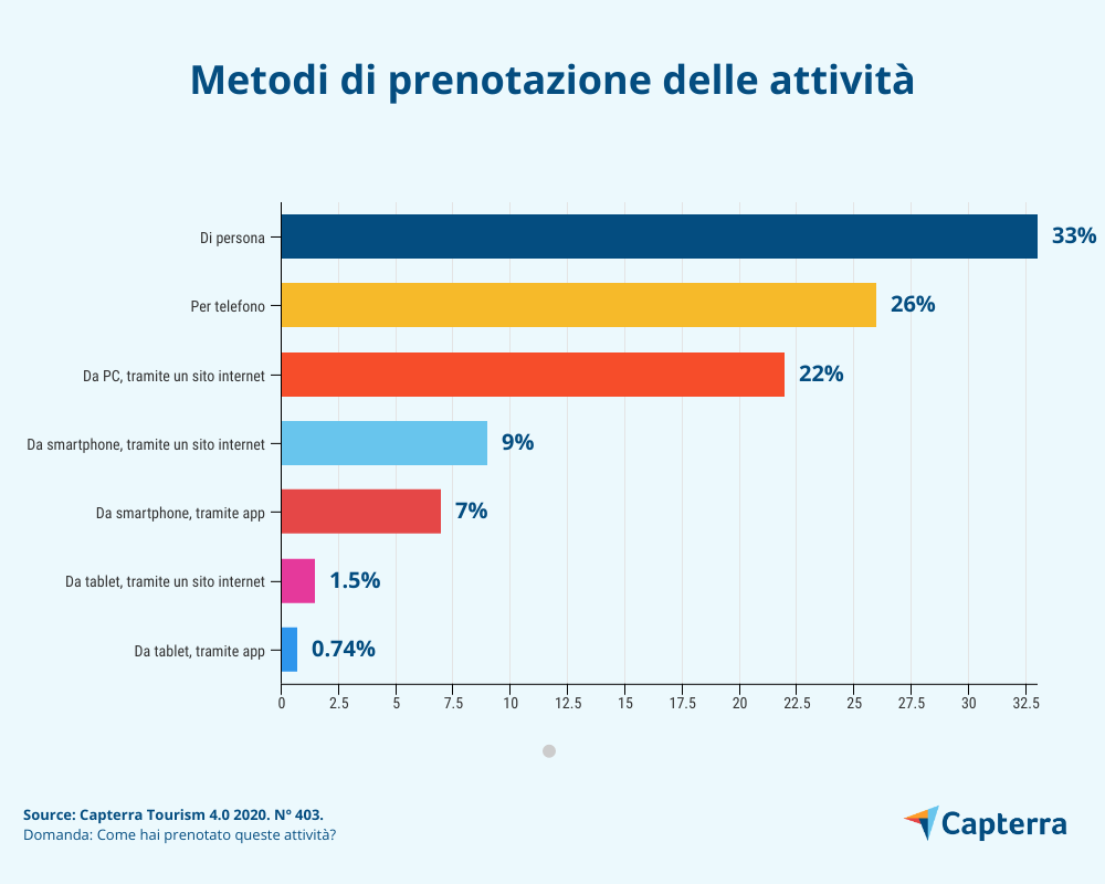 Nonostante la maggior parte degli italiani abbia prenotato tramite PC, il team di analisi di Capterra Italia ha registrato un trend in crescita per quanto riguarda le prenotazioni tramite smartphone, avvenute tanto direttamente sul sito della struttura quanto tramite app. Sommando questa percentuale al numero di utenti che hanno utilizzato il tablet, si arriva al 46% di intervistati che hanno utilizzato dei device mobili per effettuare una prenotazione.