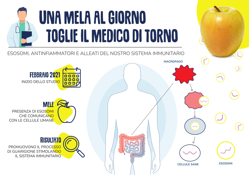 Lo studio, iniziato a febbraio 2021 e terminato a fine anno, aveva l’obiettivo di identificare quali altri fattori, oltre a quelli già noti, rendano la mela un frutto salutare a tutti gli effetti. Gli autori hanno esaminato in vitro dei campioni di mele Golden Delicious Melinda, trovando inizialmente conferma a quanto già noto, cioè che questi frutti contengono effettivamente piccole vescicole di dimensioni nanometriche, gli esosomi. Ma in questo caso i ricercatori italiani sono andati oltre, approfondendo l’attività degli esosomi delle mele e scoprendo che essi sono in grado di dialogare direttamente con le cellule umane e di trasferire il loro contenuto informativo all’organismo umano. “Una volta inglobati dalle cellule umane, gli esosomi stimolano alcune funzioni, senza alterarne il genoma. In particolare agiscono a livello del sistema immunitario favorendo l’attività anti infiammatoria” spiega Luca Lovatti, ricercatore del Reparto Ricerca e Sviluppo di Melinda.