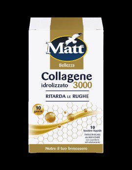 Fattori genetici, alimentazione, esposizione a raggi solari, smog, stress possono accelerare il fisiologico calo del collagene, proteina essenziale, naturalmente presente nel nostro corpo e principale responsabile del tono e della compattezza della pelle. MATT COLLAGENE idrolizzato 3000 è un integratore alimentare specificatamente formulato per ritardare la comparsa delle rughe e rendere la pelle più compatta. La sua esclusiva formulazione contiene 3.000 mg di collagene idrolizzato ed è arricchita dalla presenza del rame e dello zinco che contribuiscono a proteggere le cellule dallo stress ossidativo.