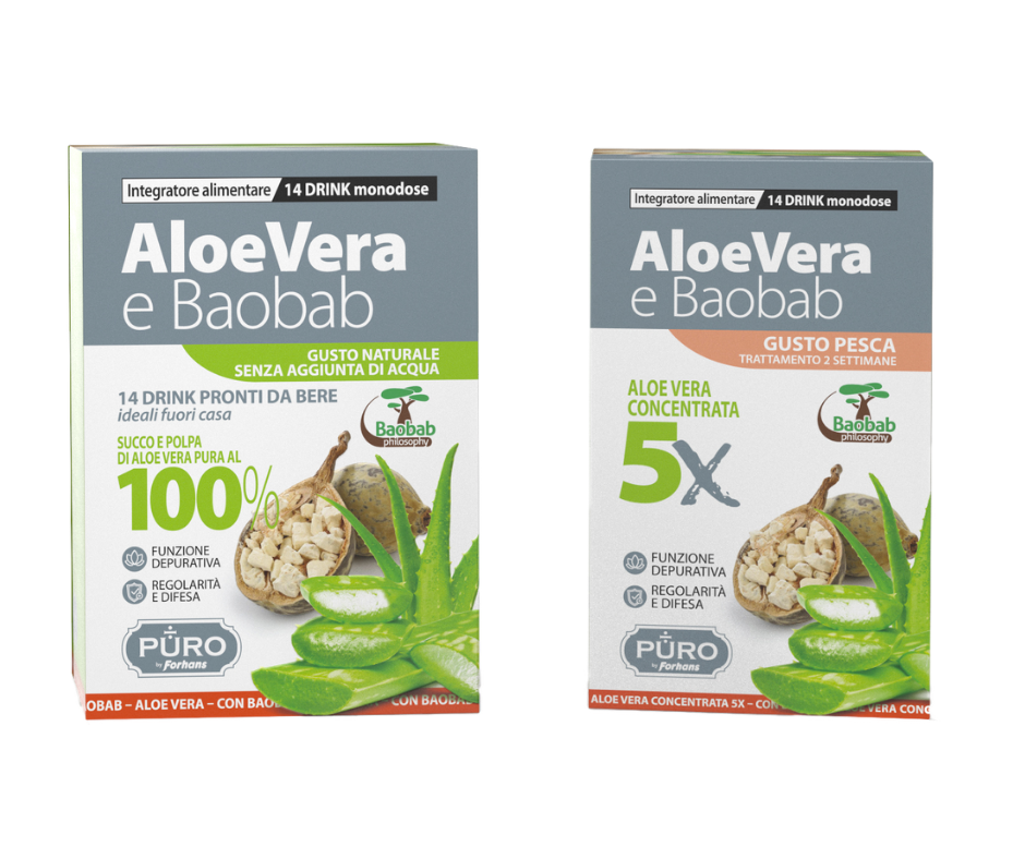 Grandi poteri racchiusi in un piccolo spazio. I pratici drink monodose degli integratori PURO by Forhans a base di puro succo di Aloe Vera e Baobab contengono tutti i vantaggi di questi portentosi ing...