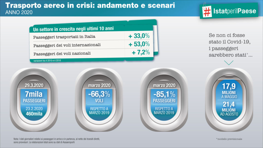 In base ai valori che descrivono l’andamento del settore, il traffico aereo nel mese di maggio 2020 sarebbe stato di circa 17,9 milioni di passeggeri trasportati e si stima che avrebbe raggiunto il picco di circa 21 milioni nel mese di agosto 2020.