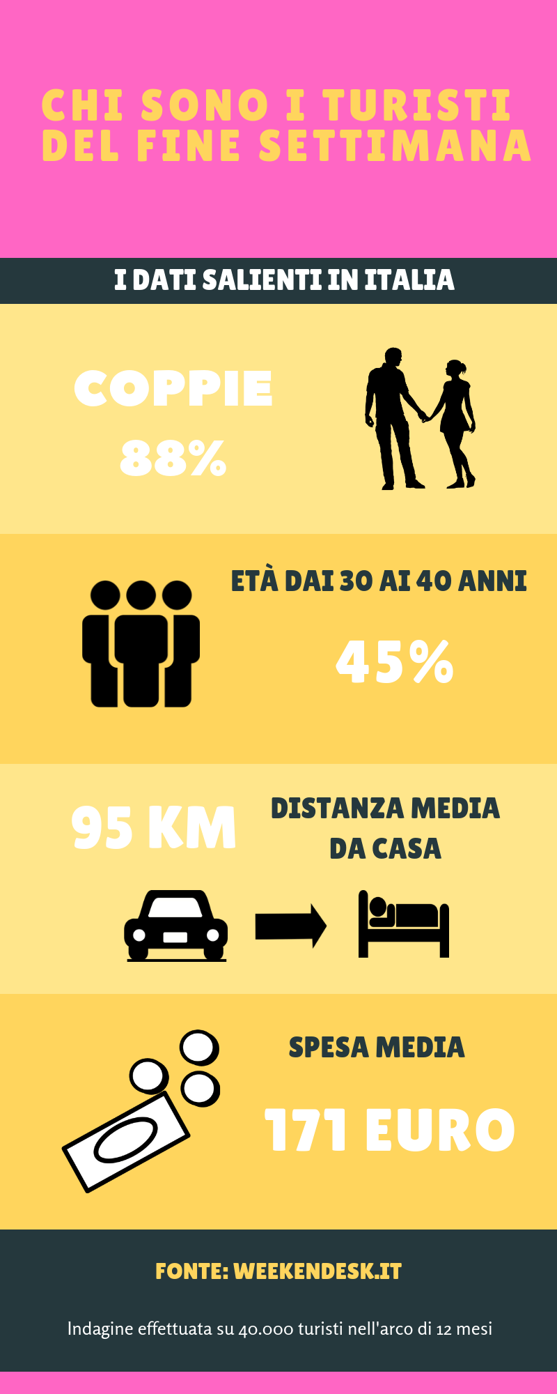 Per limitare le ore necessarie al viaggio e godersi più tempo possibile nella destinazione scelta, gli Italiani scelgono poi di non allontanarsi troppo da casa optando per una meta che dista in media 95 km dalla propria città. Per quanto concerne la durata del soggiorno, è di una sola notte nel 60% dei casi e di due notti nel 24%, con arrivo prevalentemente al sabato.