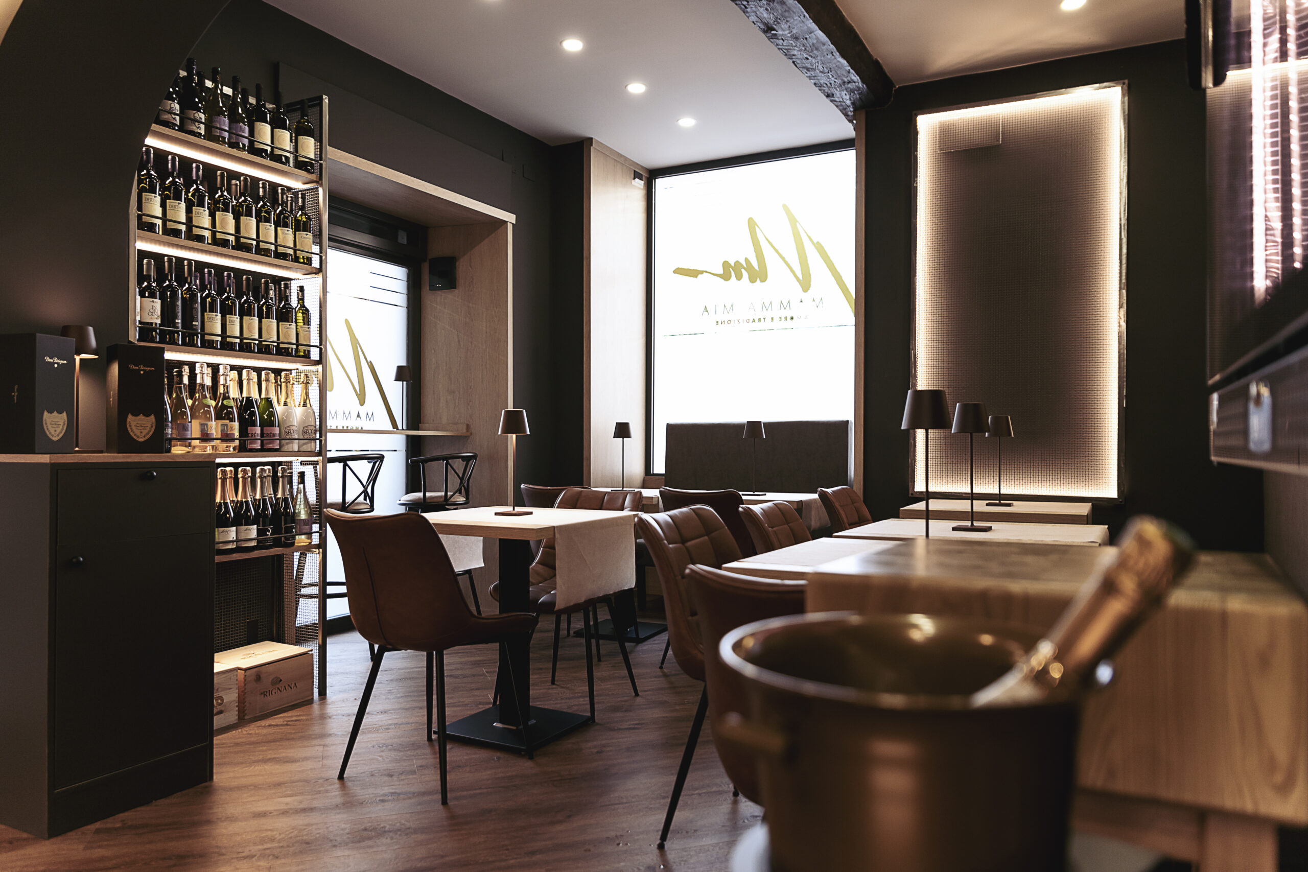 Il locale è stato pensato e progettato per creare un ambiente elegante ed esclusivo, con un numero selezionatissimo di coperti, che consentono di mantenere alto il livello dell’offerta gastronomica di Mamma mia. Le due sale interne che lo costituiscono, sono realizzate con materiali che conferiscono all’ambiente e agli arredi interni, un tocco moderno: si ritrova infatti una presenza massiccia del legno – sia per i tavoli che nei rivestimenti – con dettagli black che donano stile ed eleganza, mentre le luci soffuse creano un’atmosfera esclusiva e rilassata.
